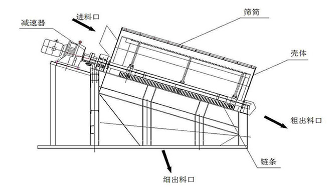 滾筒裝置傾斜安裝于機架上。電動機經減速機與滾筒裝置通過聯軸器連接在一起,驅動滾筒裝置繞其軸線轉動。當物料進入滾筒裝置后,由于滾筒裝置的傾斜與轉動,使篩面上的物料翻轉與滾動,使合格物料(篩下產品)經滾筒后端底部的出料口排出,不合格的物料(篩上產品)經滾筒尾部的排料口排出。由于物料在滾筒內的翻轉、滾動,使卡在篩孔中的物料可被彈出,防止篩孔堵塞。滾筒篩砂機、滾筒篩分機與滾筒篩的原理構造幾乎相同,是人們對它的認識和叫法上存在差異。