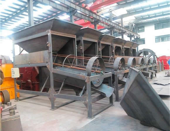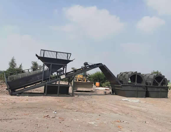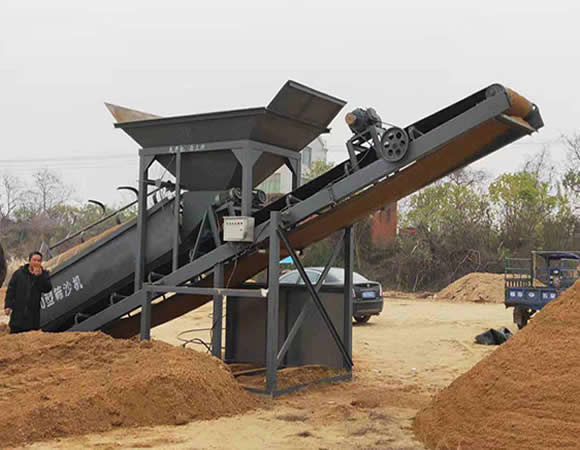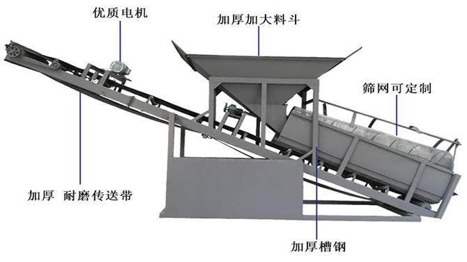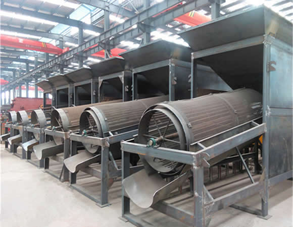 鏟車將毛料鏟入上料斗,經(jīng)傳送入轉篩,轉篩將毛料分離,沙子經(jīng)出料口傳到沙,石子經(jīng)出料口傳到石子 。